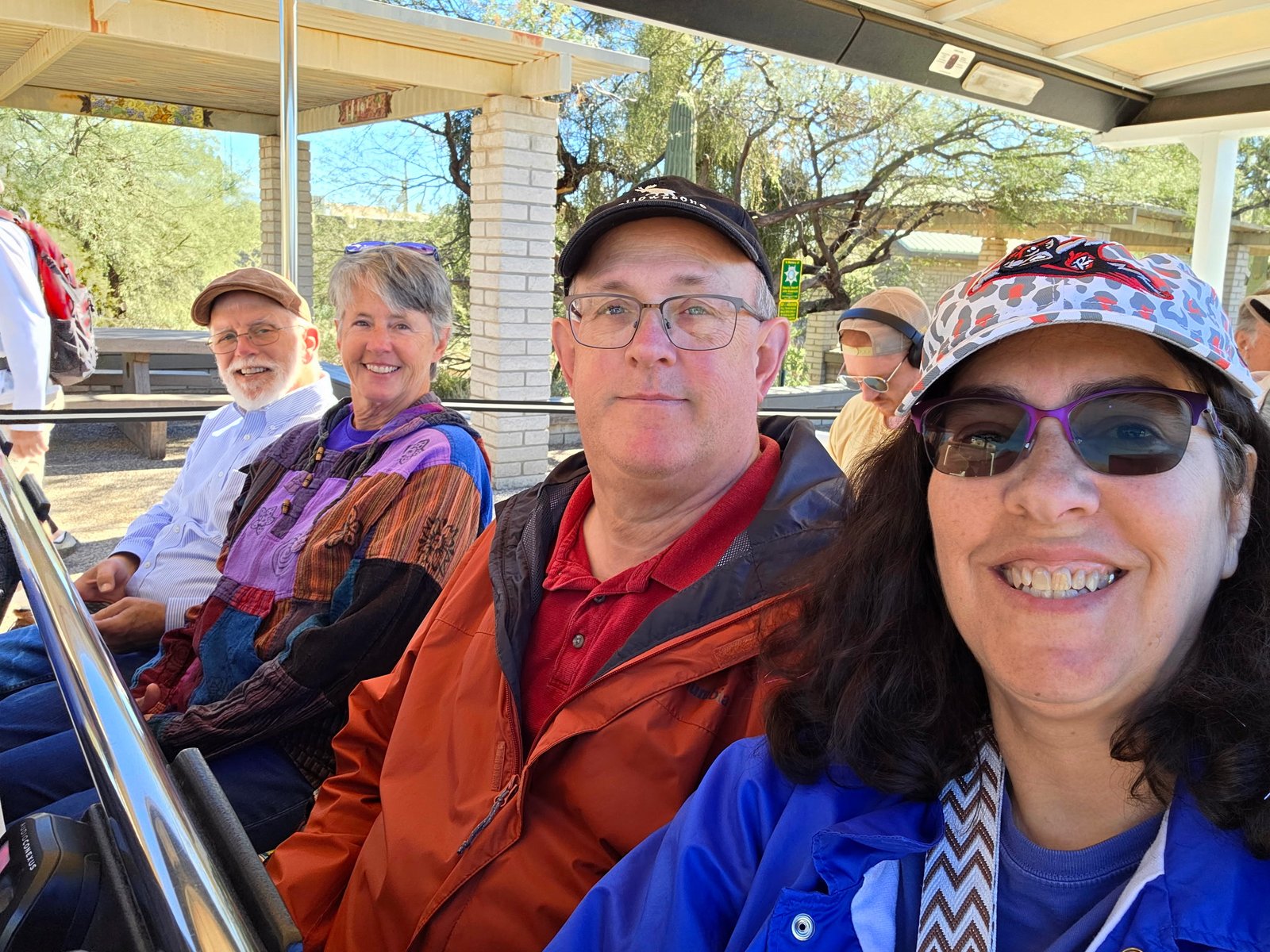 From there, we headed over to Sabino Canyon Recreation Area in the Coronado National Forest. That’s where Sharen captured the selfie of the four of us on the Sabino Canyon Crawler, the emission-free electric shuttle that ferries folks 3.7 miles up the canyon.