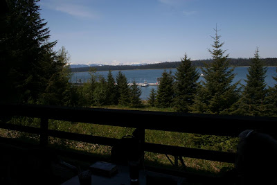 There was one really cool thing that happened today, but I didn’t get a picture of it. While Mike and I were waiting for lunch to be served, enjoying the view from the deck of the Glacier Bay Lodge (see photo below)…
