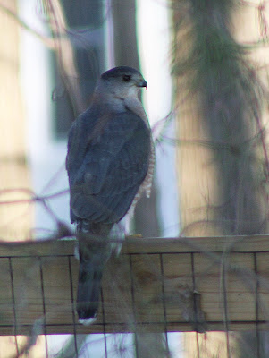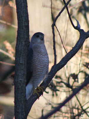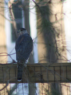 Since I started feeding the birds again yesterday, the yard was pretty busy with birds and squirrels today. I thought it would take the hawks a while to notice the smorgasbord in our backyard, but was very pleasantly surprised when this one showed up. Usually, it’s Redtailed Hawks that we see.