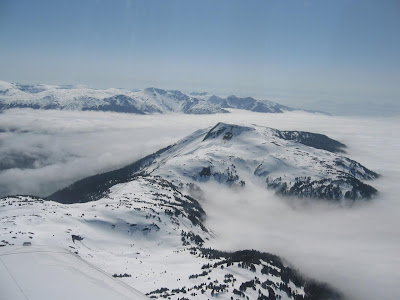 We left Juneau around 10:00 AM on a six-seater plane (that count includes the pilot). Mike and I were the only passengers. It was sunny and clear in Juneau, but a huge fog bank was hanging between some of the mountains. In the pictures, what looks like a flat white snowfield is actually clouds.