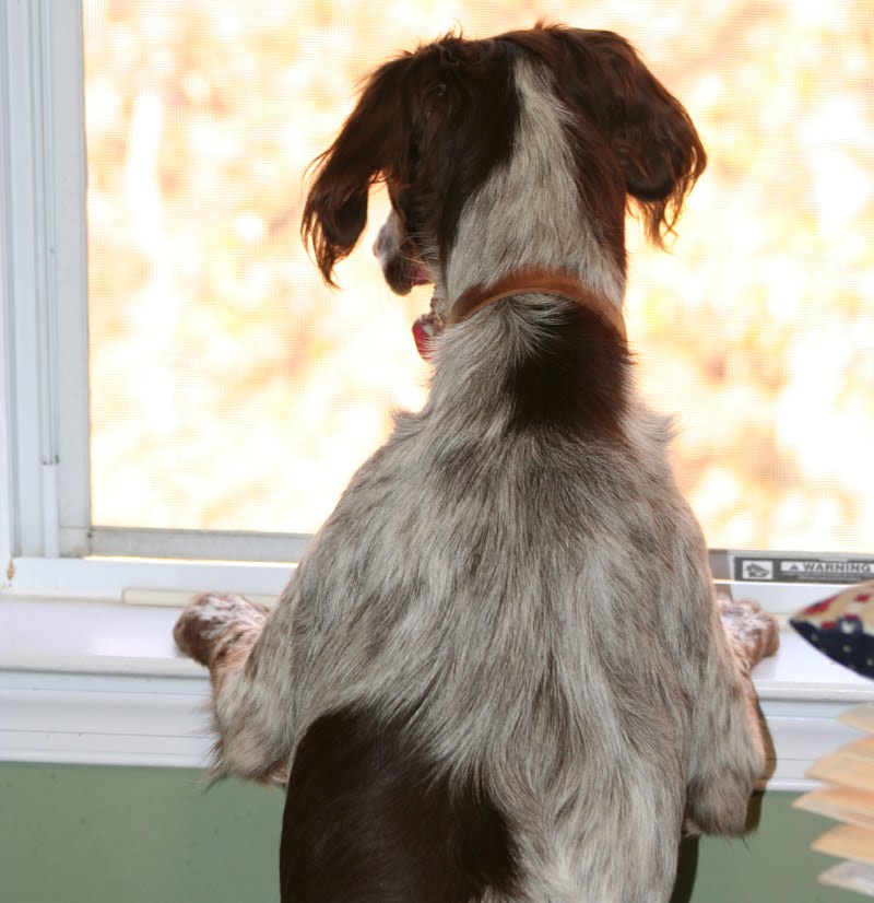 Belle has always been crazy about critter watching. She can sit by the sliding doors for hours on end, still and quiet as a mouse, watching the birds and squirrels in the backyard. K, as shown here looking out of my office window, is similarly enthralled. But there’s a problem…