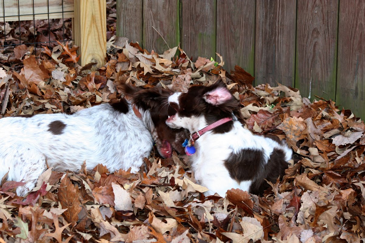 They’d been chasing each other around the yard, flopping in the leaves. Somehow, they ended up laying in the leaves for a while, just wrestling with their heads. It was very cute.