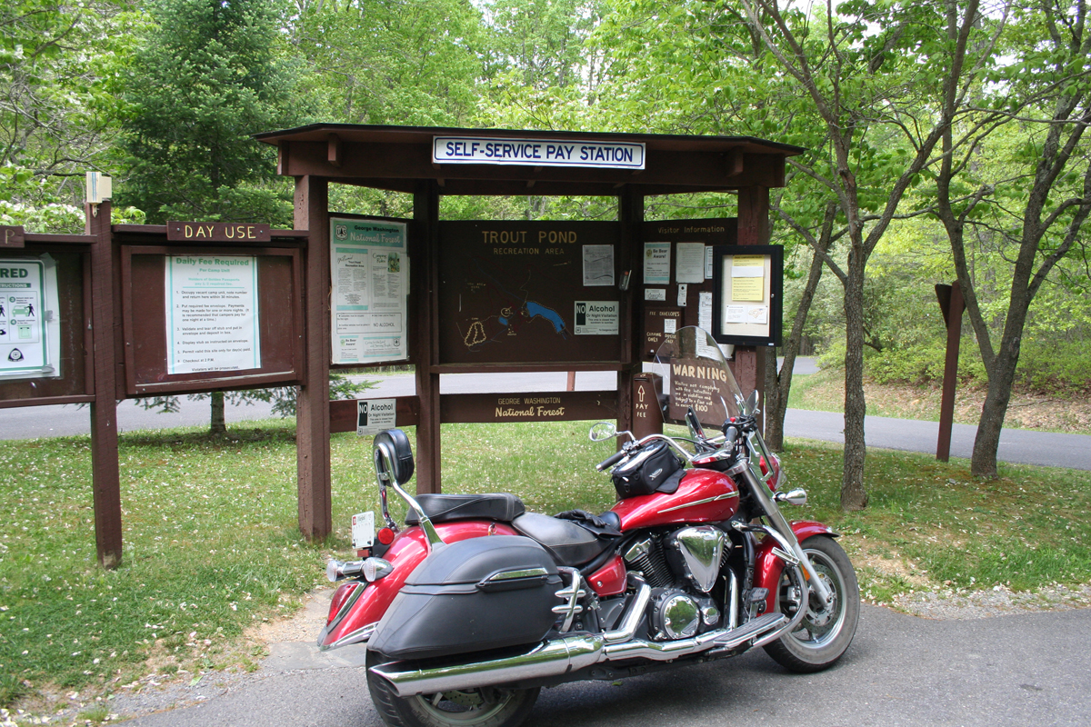 It wasn’t long at all before I encountered a sign welcoming me to the George Washington National Forest. When I saw a sign for Trout Pond Campground, which I hadn’t been expecting, I turned in. Where there are campgrounds, there are usually coffee download stations (toilets), which I needed at that particular moment. I was also hoping to see what Trout Pond actually looked like.